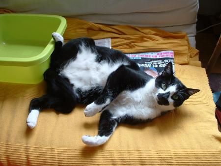 Spike : Celui-là a le ronron académique, c'est plutôt le miaou qui pêche... Avec ces deux-là, on fait un chat entier normal... Doit son nom au vampire hilarant du même nom de la série "Buffy contre les vampires", car tout bébé, on pensait qu'il deviendrait un vrai démon... Et ça tombe bien, il a les canines de Dracula ! Surnommé "le Philosophe", car il a très souvent l'air grave, inspiré, pensif. Pensées très certainement tournées vers sa gamelle, son dodo, ou l'éventuel squattage des genoux du premier malheureux qui passe... Spécialités : se frotter sur les jambes, les murs, les chaises, etc., roucouler comme un pigeon pour ponctuer tous ses actes, se jeter par terre en plein milieu du passage, essayer d'attraper les mouches (sans grand succès) et râler parce que les pigeons ne veulent pas venir le voir. Plutôt tendance "Chat des champs", l'Indiana Jones des deux, capable aux Antilles de partir deux jours et de revenir tout égratigné et d'attraper des tourterelles...
